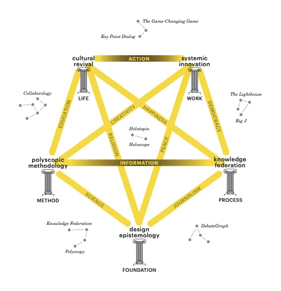 The holotopia vision is not a future vision in an ordinary sense; it is a vision of our world today; which shows how this world can and has to be transformed. In the above holotopia ideogram, this vision is rendered as five pillars; which represent holotopia’s five insights. The yellow lines suggest that when other pivotal themes (including creativity, happiness, democracy and education) are considered in the context of the five insights—their comprehension and handling too will be thoroughly reversed.
